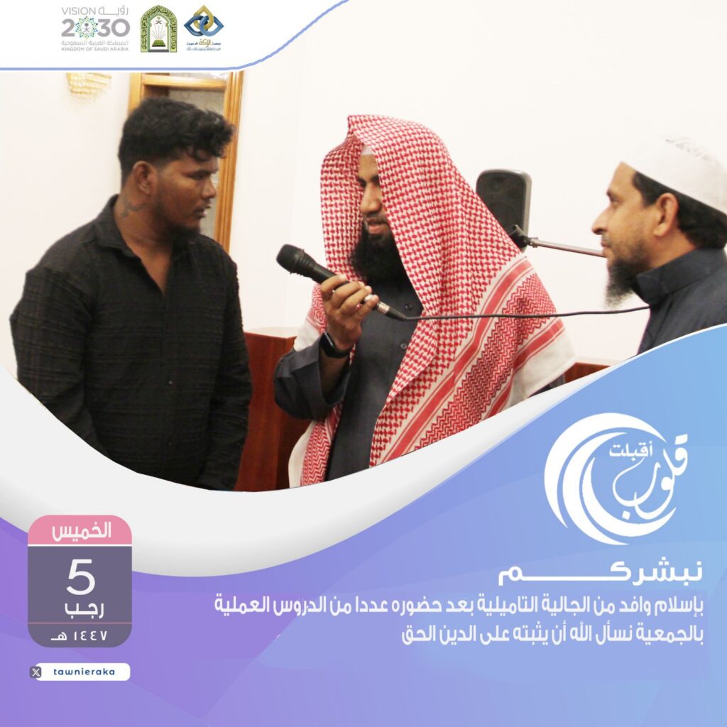 يحظى المسلم الجديد لدى جمعية الراكة الدعوية باهتمام كبير ومتابعة مستمرة من خلال مجموعة من الفعاليات المخصصة للجاليات مثل الزيارات الميدانية لأماكن تجمع الجاليات بالمصانع والشركات ، كذلك المسابقات الالكترونية ، ولقاءات مختلفة عبر منصات التواصل الاجتماعي مثل الفيس بوك وكذلك البرنامج المميز #قلوب_أقبلت وكان من ثمرات هذه الفعاليات المباركة وفي هذه الأيام المباركة إسلام وافد من الجالية التاميلية بعد حضوره عدداً من الدروس العلمية بجمعية #الراكه ، وسط سعادة بالغة من منسوبي الجمعية داعين الله له بالثبات .