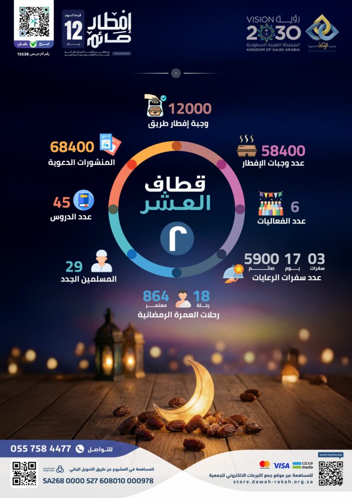إن ما تحقق خلال العشر الثانية من الشهر الفضيل هو ثمرة عطائكم وثقتكم، وامتداد لجهود لا تنقطع في دعم البرامج الدعوية والإيمانية والخدمية. وبفضل الله ثم بدعمكم، تواصل جمعية الراكة الدعوية أداء رسالتها في إيصال الخير لمستحقيه، وترسيخ قيم التكافل في هذا الشهر المبارك.